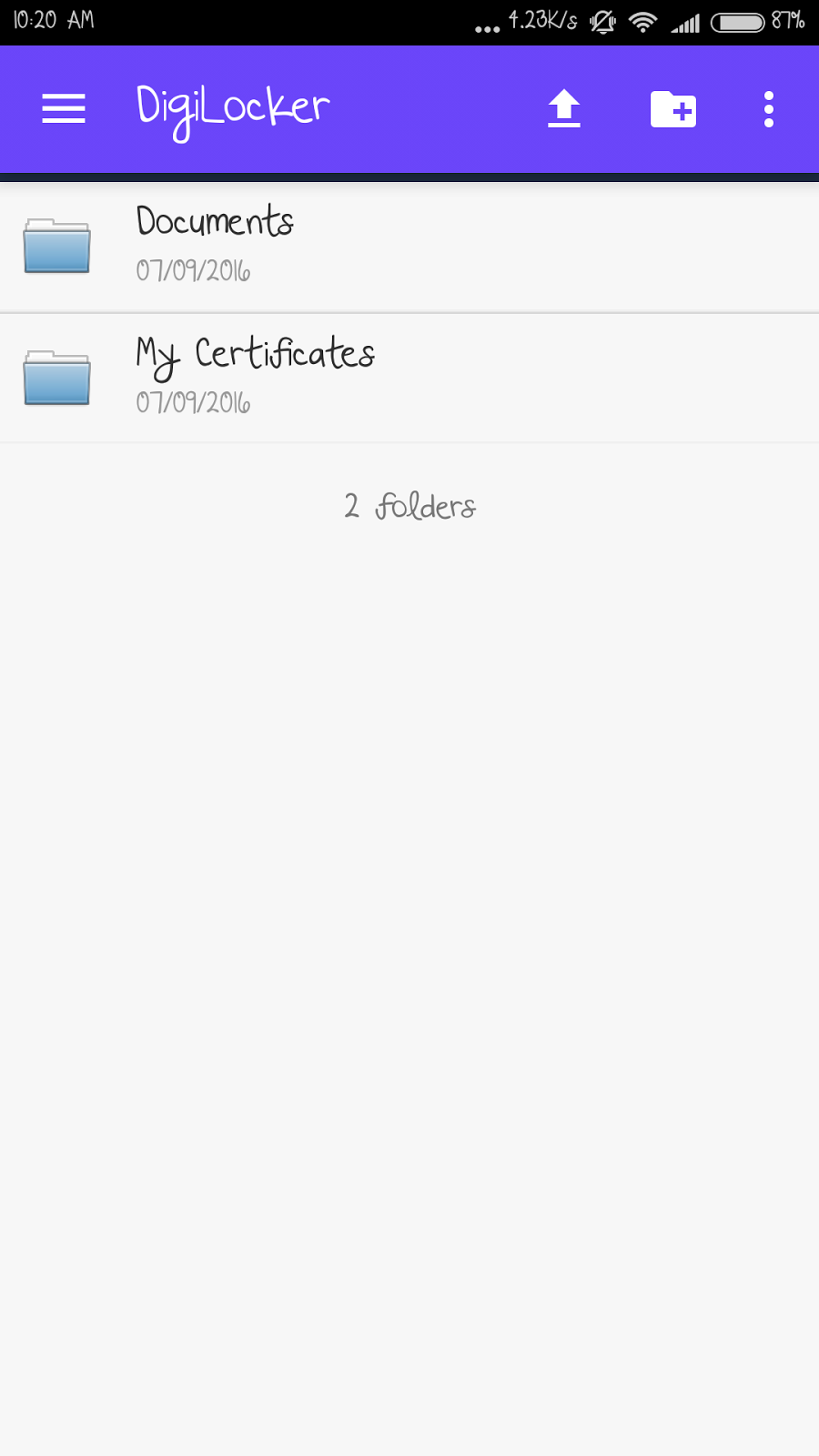 यहाँ आपको दो फोल्डर पहले से ही मौजूद दिखाई देंगे इन्हें आप अपनी जरुरत के हिसाब से बदल सकतें हैं। ⬆ ऊपर की तरफ तीर जैसे दिख रहे विकल्प पर क्लिक करके आप अपने डाक्यूमेंट्स को इसमें अपलोड कर सकतें हैं। ➕ फोल्डर पर बने धन के निशान पर क्लिक कर के आप अपनी जरुरत के हिसाब से फोल्डर बना सकतें हैं। जैसे डिग्री के अलग, वहां के अलग, जमीन के कागजात अलग ये आपकी सहूलियत पर निर्भर करता है।