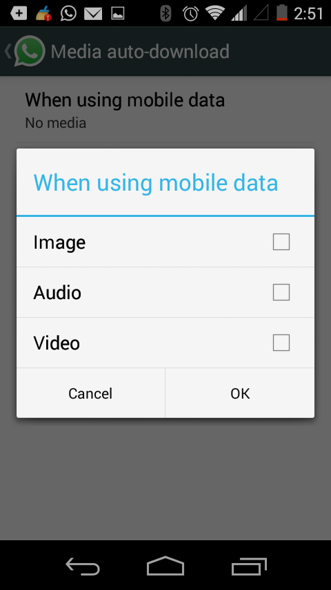 4. WhatsApp का ऑटो डाउनलोड रखें बंद: वाट्सएप पर आपको आने वाले फ़ोटो और विडीओ यदि अपने आप ही आपके मोबाइल पर डाउनलोड हो जाते है, तो इससे आपके मोबाइल पर कई अनचाहे डाटा डाउनलोड हो जाते है, इसे WhatsApp की सेट्टिंग में जाकर बैंड कर दें।