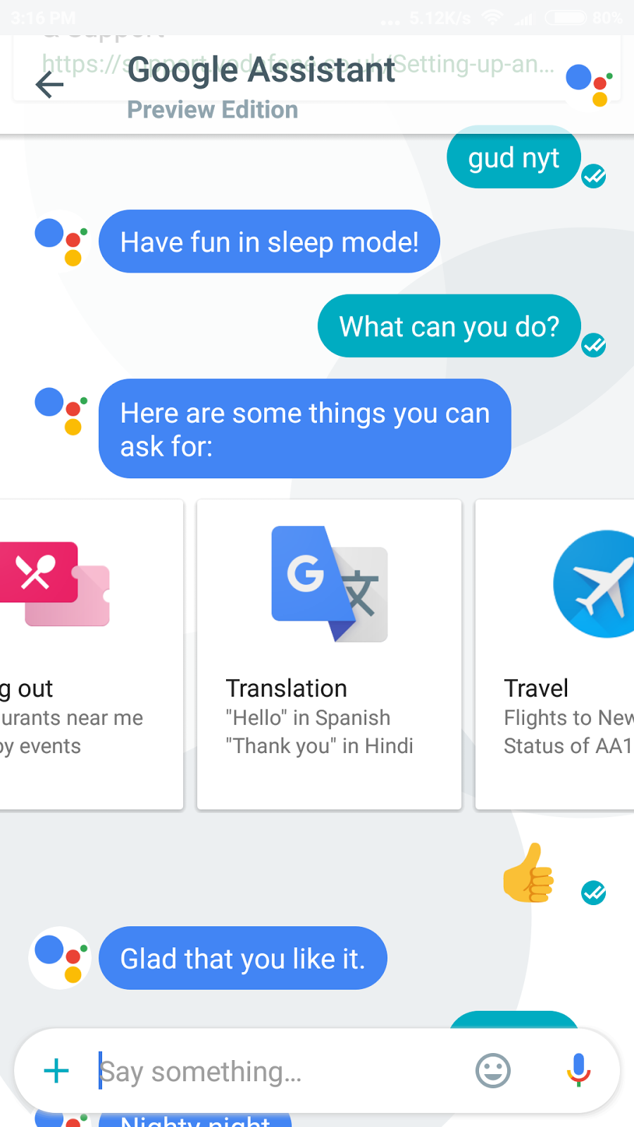 गूगल असिस्टेंट इसके वो फीचर है, जो इसे अन्य मेस्सगिंग एप्प से एकदम अलग बना देता है। आप इस अस्सिटेंट से अपने मन के सवाल पूछ सकतें हैं। जैसे सामान्य ज्ञान के सवाल, मौसम के बारे में, फ्लाइट्स के बारे में या फिर किसी खेल के स्कोर के बारे में ये गूगल सर्च इंजन के इस्तेमाल से सभी जानकारियां आपको उपलब्ध करा देता है और इसके लिए आपको अन्य किसी एप्प को खोलने की जरुरत भी नहीं पड़ती। आप किसी व्यक्ति से चैट के दौरान भी इसका इस्तेमाल कर सकतें हैं। इसके लिए सिर्फ आपको चाट के दौरान @google का इस्तेमाल करना पड़ता है।