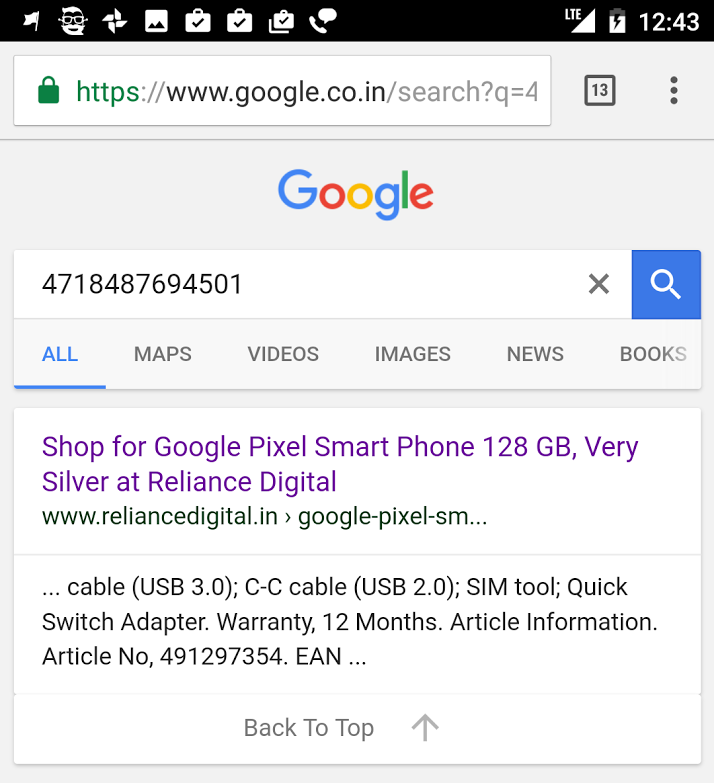 5. बारकोड का नम्बर कापी आकरने के लिए “Copy Content” पर क्लिक करें और इस बारकोड वाली वस्तु के बारे में अधिक जानकारी के लाइन “Product Search” पर क्लिक करें।
