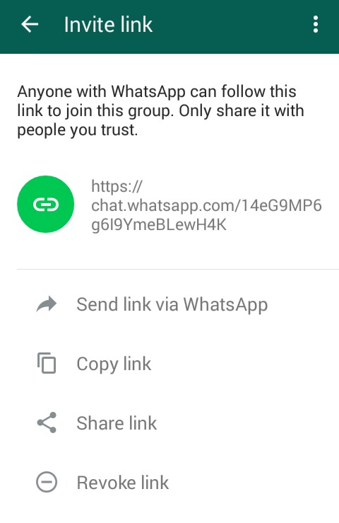 6. यह करने के बाद आपको ग्रुप लिंक के साथ आपको तीन ओप्सन और मिलेंगे। जिसमें से आपको तीसरे ओप्सन मतलब की Revoke Link पर क्लिक करना होगा।